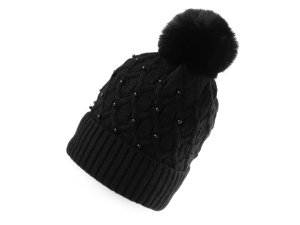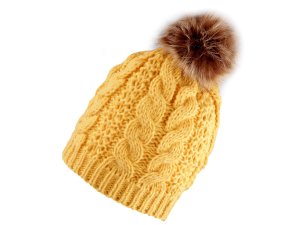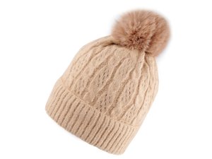 Pletená čepice s velkou bambulí a ohrnutým okrajem má zajímavý copánkový vzor.