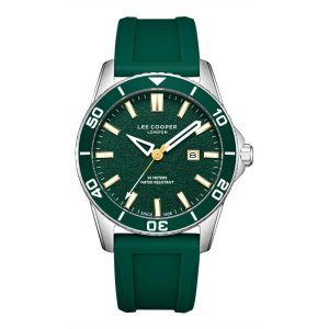Pánské náramkové hodinky Napájení z baterie Průměr pouzdra 42,0 mm Pouzdro ve tvaru kruhu Kovové pouzdro Stříbrná barva pouzdra Zelená barva tahu Ručičkový ciferník Zelená barva ciferníku Ciferník s …