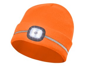 Zimní čepice s integrovaným LED světlem a reflexními pruhy určená pro dospělé.