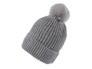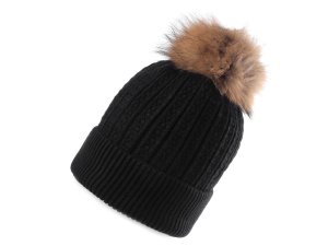 Pletená čepice s velkou kožešinovou bambulí a ohrnutým okrajem má zajímavou strukturu.