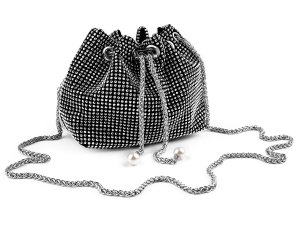 Elegantní stahovací kabelka ozdobená broušenými kamínky se efektně třpytí.