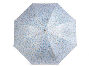 Velký dámský deštník s potiskem malých květů je vystřelovací, konstrukci má z kovového drátu a pružných lamel, které tvoří osm polí.