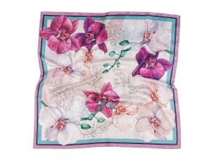 Saténový šátek s potiskem je velice kvalitní, elgantní, využijete jej na každodenní nošení.