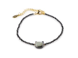 Náramek z broušených korálků je ozdobený perleťovým korálkem kočky.