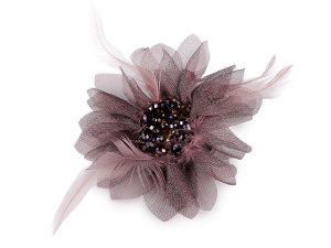 Velká elegantní brož je vyrobená z jemného šifonu, který připomíná květinu, a její střed je zdobený peřím a třpytivými broušenými korálky, které jí dodávají luxusní vzhled.