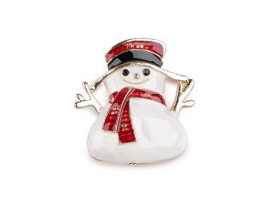 Vánoční brož se sněhulákem je ozdobená barevným smaltem.