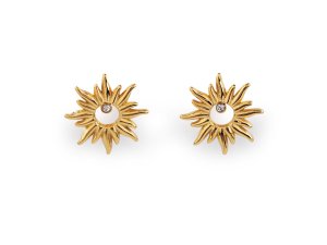 Decentní náušnice z nerezové oceli zdobí motiv slunce, které je uvnitř ozdobené třpytivým broušeným kamínkem.