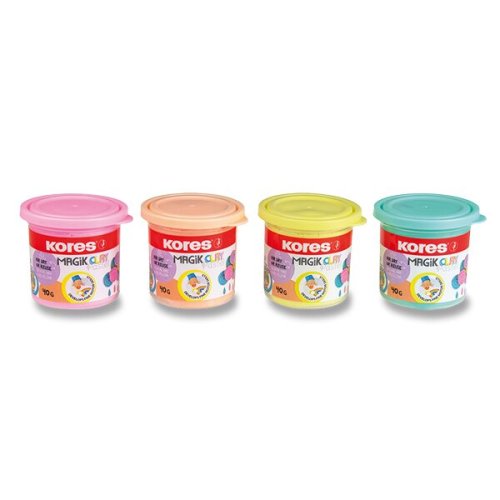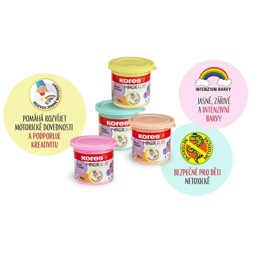 tvrdnoucí na vzduchu, * snadno míchatelné barvy, * hmota uzavřená v kelímku, nevysychá, * před ztvrdnutím je hmota PRUŽNÁ A SKÁČE, * po zatvrdnutí je MOŽNÉ HMOTU MALOVAT A DEKOROVAT, * NETOXICKÁ, * OBSAH 4 X 40 G A 2 X 5 G ČERNÁ A BÍLÁ BARVA, TIP: SKÁKACÍ MODELÍNU KORES MAGIC CLAY MÁME I V ZÁKLADNÍCH BARVÁCH.