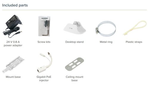 Přístupový bod je poté dodáván s kompletním příslušenstvím pro montáž na zeď, strop či sloup, takže již nemusíte cokoliv dokupovat. Součástí dodávky tak je 24V/0,8A napájecí adaptér, držák na stůl, kovová páska, stahovací plastová páska, kovový úchyt na stěnu, GbE PoE injektor, kovový úchyt na strop, sada šroubků a uživatelský návod