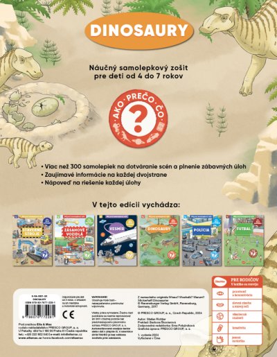 Jak? Proč? Co? V tomhle naučném samolepkovém sešitě pro děti od 4 do 7 let najdete odpovědi snad na všechny zvídavé otázky týkající se dinosaurů a éry, kdy žili. Na každé dvoustraně se dočtete spoustu zajímavostí, a navíc máte k dispozici přes 300 samolepek k dotváření scén a plnění zábavných úkolů! Ty zapeklitější vám dají možná trošku zabrat, ale žádný strach – na konci knížky nechybí malá nápověda…