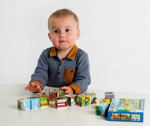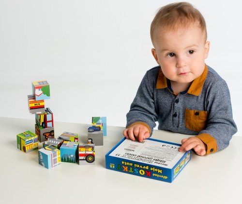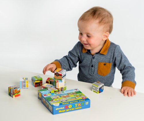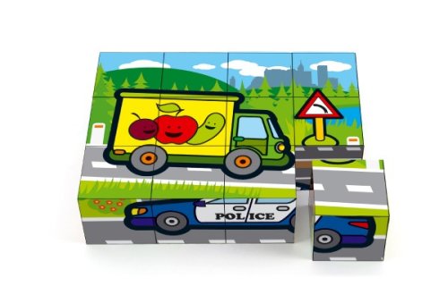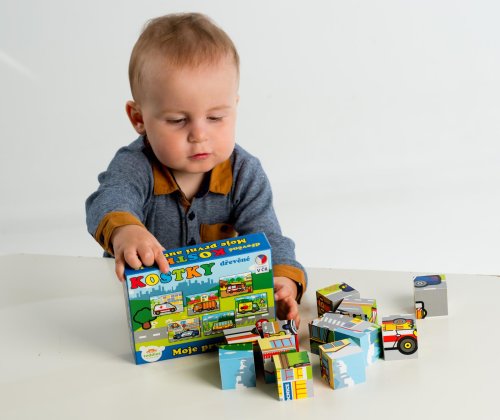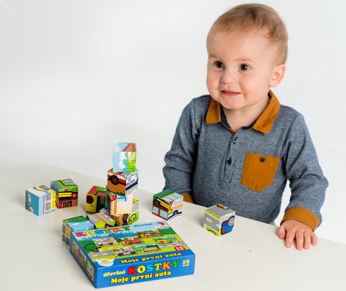 Dřevěné kostky s obrázky dopravních prostředků. Kostky s motivy aut jsou uloženy v praktické papírové krabičce. Balení obsahuje předlohy pro snadnější skládání. Vhodné od 3 let.