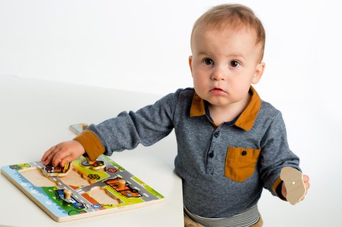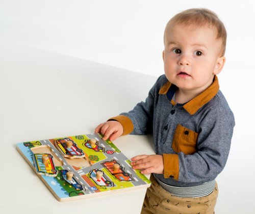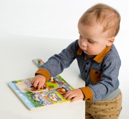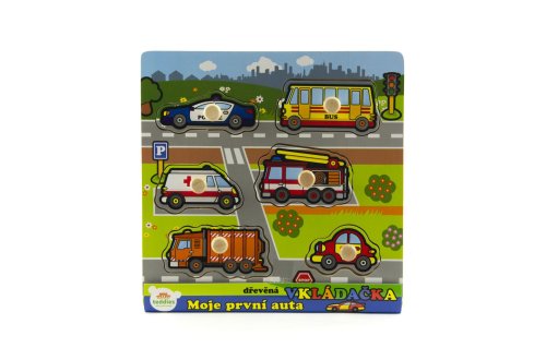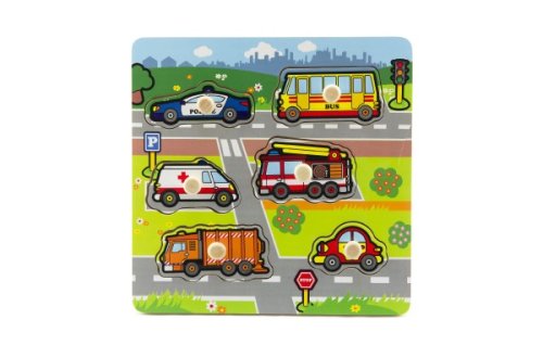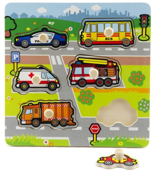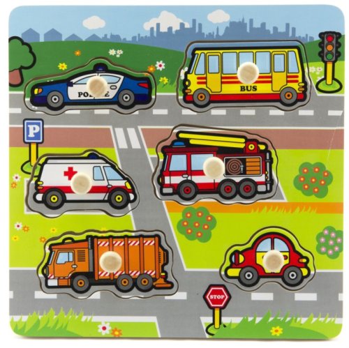 Obsahuje 6 dílků s úchyty, které musí děti správně umístit do dřevěné desky s otvory tak, aby získaly obrázek silnce s auty. Velikost: 22,5 x 22,5 x 2,5 cm Vhodná od 12 měsíců.