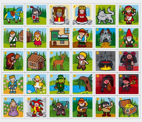 Papírové pexeso obsahuje 32 dvojic s veselými obrázky na motivy klasických pohádek. Děti si mohou sestavit i krabičku, do které si všechny kartičky mohou uklidit.