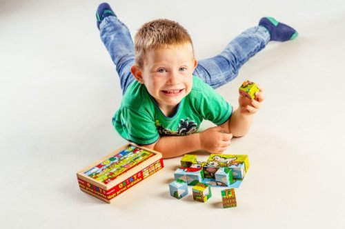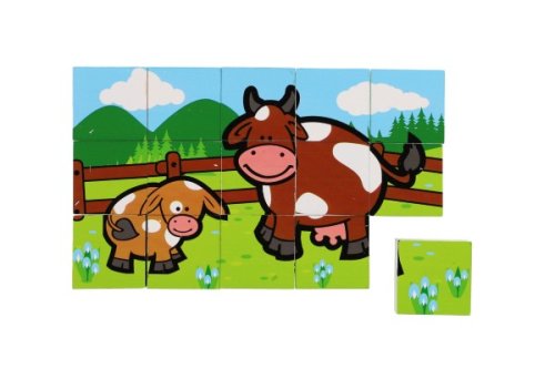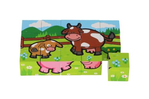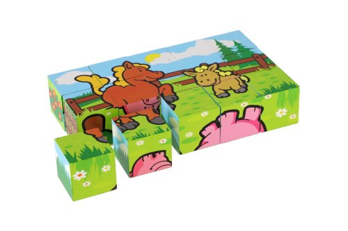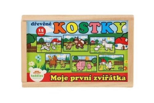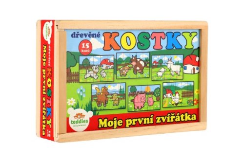 Dřevěné kostky s barevnými obrázky domácích zvířátek jsou výbornou volbou pro nejmenší. Při jejich správném poskládání se zobrazí jeden ze šesti obrázků, hra tím napomáhá rozvíjet u dětí logické uvažování, fantazii a jemnou motoriku. Při stavění a bourání komínů děti zjistí, jak funguje rovnováha a pomůže jim to v chápání příčiny a následku. Obsahuje 15 ks, v dřevěné krabičce 20 x 13 x 5,2 cm. Vhodné pro děti od 12 měsíců.