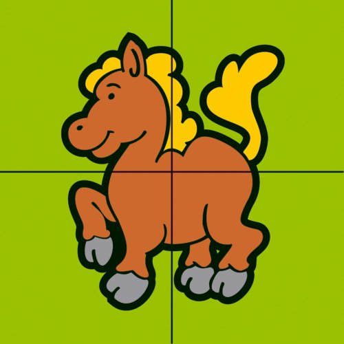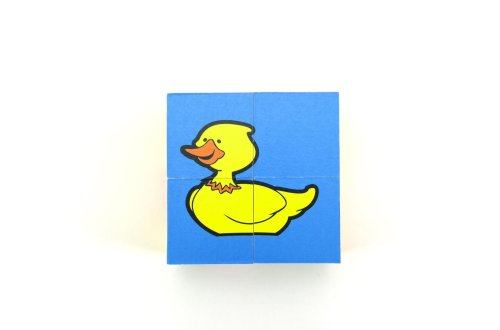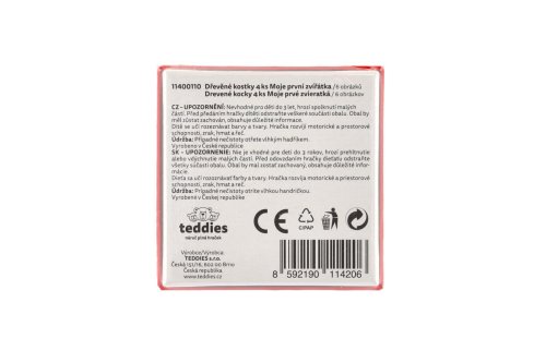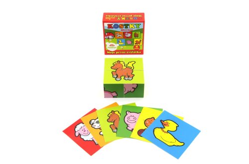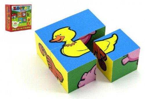 Čtyři dřevěné obrázkové kostky s motivem domácích zvířátek v papírové krabičce, z nichž je možné sestavit šest různých obrázků. Vhodné od 3 let.