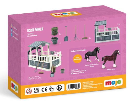 Novinka červenec 2023 - Poznejte svět koní a jejich potřeb k chovu! V tomto setu najdete stáj i s vybavením, kde koníci bydlí. Z vybavení je zde lopata, vydle, smeták, kyblík, pytel ovsa a košík na seno. Tato realistická stáj může dětem dopomoci poznávat skutečné vlastnosti a charakter její předlohy. Každý produkt je přísně testován dle široké řady mezinárodních standardů. Ohrada je ručně malována. Koně nejsou součástí balení. Upozornění: Není vhodné pro děti do 3 let, obsahuje malé součásti – hrozí nebezpečí udušení. Balicí materiál není hračka. Hlavní vlastnosti: ručně malovaná ohradavěrohodné detaily i zbarvenívyrobeno z PVC bez ftalátůvhodné od 3 let