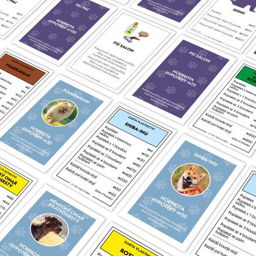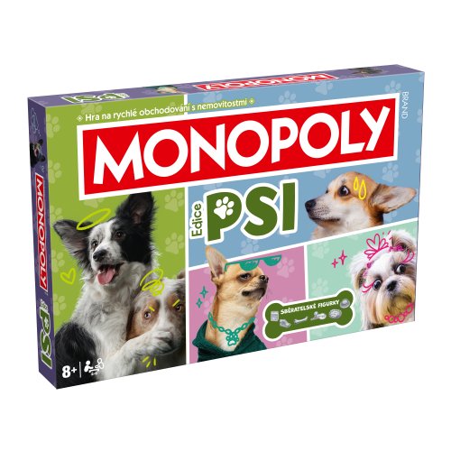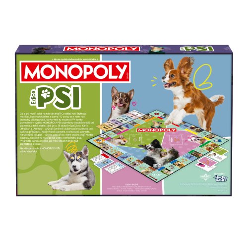 MONOPOLY Psi nová verze CZ. Společenská hra MONOPOLY s tématikou pejsků. Pro 2-6 hráčů. Obsahuje 6 unikátních sběratelských figurek. Co si psi myslí, když na nás tak zírají? Co dělají naši čtyřnozí mazlíčci, když odcházíme z domu? O co by se s námi náš čtyřnohý přítel podělil, kdyby mel tu možnost? V tomto povedeném vydání MONOPOLY PSI objevíte ty nejoblíbenější psí plemena, a také zjistíte, jaké je to žít skutečný psí život. Karty „Hračky” a „Pamlsky”, skrývají úsměvné ukázky psí moudrosti pro