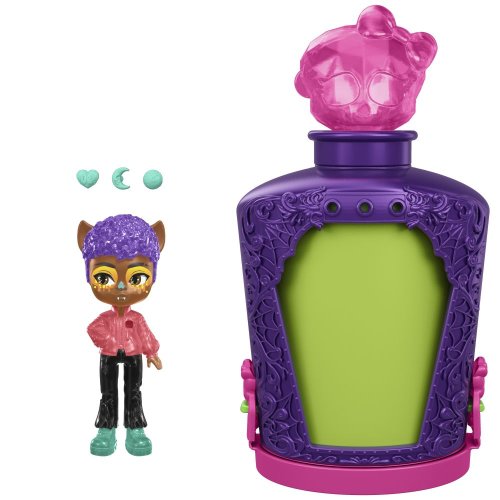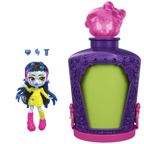 Darujte Monster High™ panenku v děsivé velikosti! Stačí namíchat lektvar a získáte strašidelné překvapení. Herní set Monster High™ Elixíry s malou monsterkou obsahuje kouzelné lahvičky s přibližně 7 cm velkou figurkou oblíbené příšerky Monster High™ a tři "kouzelné" přívěsky pro vlastní zábavu! Uvařte lektvar ve čtyřech krocích: do lahvičky nalijte vodu a vložte do ní přívěsky, protřepejte a sledujte, jak se tvoří lektvar, vylijte směs a pak odhalte panenku!