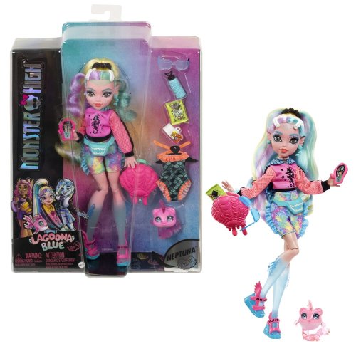 Škola je opět v plném proudu a lehce přízrační studenti z Monster High™ dokáží dát školní uniformě pěkně na frak! Lagoona Blue™ doslova proplouvá školními chodbami v outfitu, který se veze na poslední módní vlně. Síťované rukávy na pastelově růžovém topu jsou inspirovány rybářskou sítí a batikovaný duhový overal s krátkými nohavicemi vypadá jako z mořských korálů. Trendy ledvinka, sandály na vysoké platformě a batoh posetý lasturami potvrzují její dokonalý vkus. "Metalické" plavky s detaily v podobě rybích šupin a její roztomilý mazlíček, rybička Neptun™, udělají z Lagoony Blue™ dokonalou hvězdu. Panenka nemůže stát samostatně. Barvy a provedení se mohou lišit.