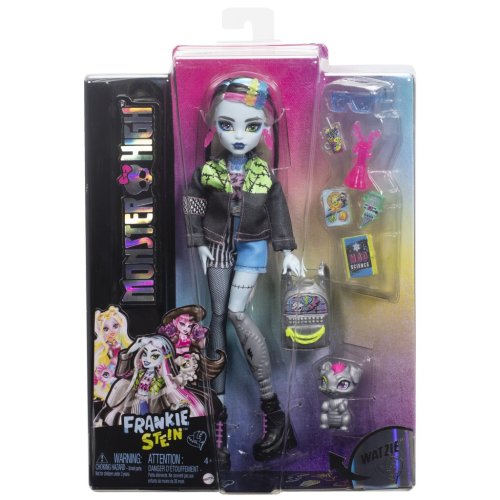 Příšerka monsterka Frankie™ z Monster High™ je ve svém elektrizujícím džínovém oblečku ikona strašidelného módního stylu! Psí mazlíček Watzie™ stojí jako vždy věrně po jejím boku. Panenka Frankie Stein™ s kloubovým tělem a jedinečnými doplňky pro vyprávění příběhů je skvělým dárkem pro děti od 4 let. Panenka nemůže stát sama. Barvy a dekorace se mohou lišit.