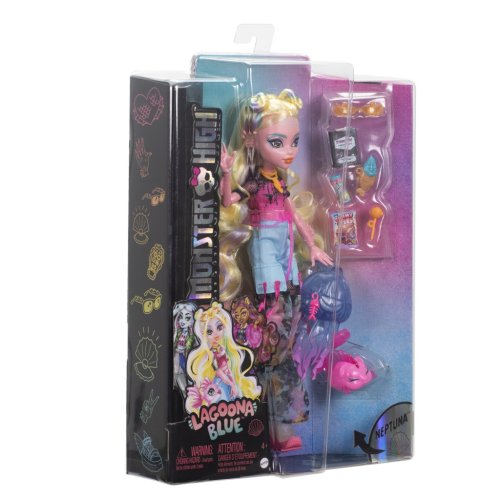 Příšerka monsterka Lagoona™ z Monster High™ je fantastické mořské monstrum! Lagoona Blue™ vyzařuje neuvěřitelně cool styl ve svém oblečku, její mazlíček piraňa Neptuna vypadá stejně skvěle! Panenka s kloubovým tělem a jedinečnými doplňky pro vyprávění příběhů je skvělým dárkem pro děti od 4 let. Panenka nemůže stát sama. Barvy a dekorace se mohou lišit.