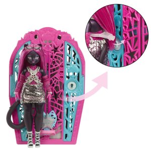 Odhalte tajemství Hauntlywoodu s Monster High! Vyřešte záhadu, otevřete brány Hauntlywoodu a odhalte kloubovou panenku Monster High. Děti se mohou stát strašidelnými detektivy a hledat stopy na mapě pomocí „kouzelného“ zvětšovacího klíče. Po cestě je čeká více než 19 úžasných překvapení, včetně třpytivých oblečků, děsivých rukavic a oslnivého šperku. Po skončení hraní si děti mohou uklidit monsterku, oblečení a doplňky do hvězdného šatníku, který je ideální nejen pro ukládání, ale i pro vyprávění příběhů. Každá panenka se prodává samostatně v závislosti na dostupnosti. Panenky neumí samostatně stát. Barvy a vzhled výrobku se mohou lišit.
