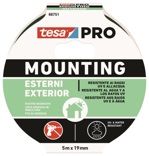Pevná a odolná tesa PRO Montážní páska pro venkovní použití je primární volbou upevňovacích řešení pro snadnou a stabilní montáž venkovních předmětů na zeď – odolná vůči UV záření, vodě a teplotě