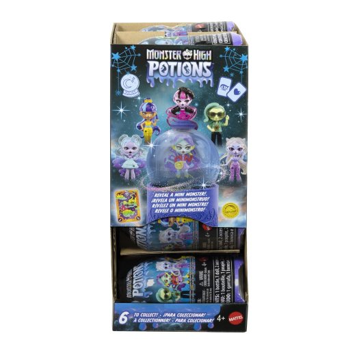 Darujte dárek v podobě děsivě roztomilé malé panenky Monster High s herním setem kouzelný lektvar. Když lektvar zmizí, objeví se panenka. Každý set obsahuje figurku oblíbené postavy z Monster High ve velikosti přibližně 8 cm, dekorativní přívěsek a kartu s věštbou pro ještě více zábavy! Lektvar připravíte ve třech krocích: nalijte vodu do koule, protřepejte ji a sledujte, jak se lektvar vytvoří, pak otočte kouli, aby se objevila panenka! Děti od 4 let si zamilují rozbalování, hraní si a vystavování této novinky ve své Monster High sbírce. Každý prodáván samostatně podle dostupnosti. Panenky neumí samostatně stát. Barvy a vzhled výrobku se mohou lišit.