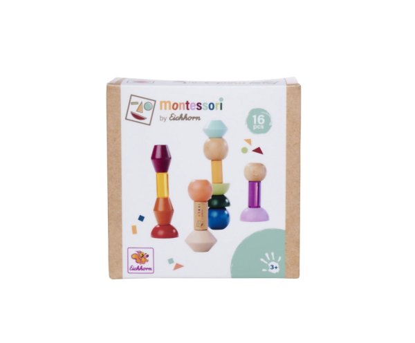 Tyto speciální geometrické stavebnice vyžadují trochu zručnosti. Ze 16 barevných stohovacích bloků můžete postavit vysoké věže a různé tvary. Vaše děti se naučí 5 nových geometrických tvarů a zamilují si dvě akrylové skleněné cihly. Bloky Montessori jsou vyrobeny ze 100% dřeva s certifikátem FSC a jsou vhodné pro děti od 3 let.
