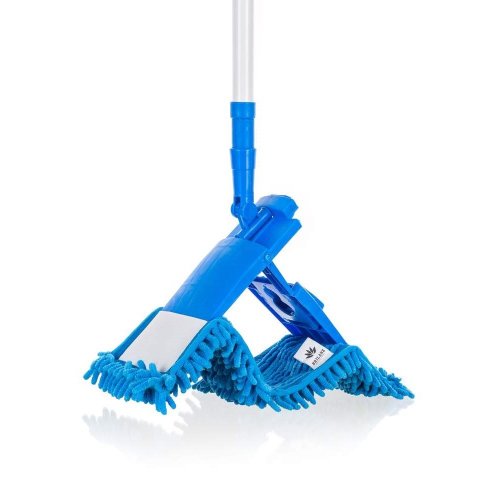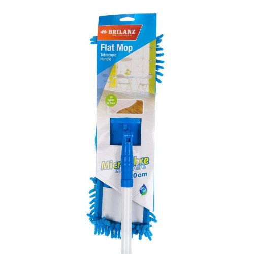 Plochý žinylkový mop od značky BRILANZ vám usnadní pravidelné mytí podlah v domácnosti. Díky teleskopické tyči nastavitelné od 68 do 120 cm už se nebudete muset k úklidu ohýbat. Materiál zvaný žinylka, složený z 80 % polyesteru a 20 % polyamidu, dokonale čistí všechny podlahové krytiny. Bílá ocelová tyč s tmavě modrými plastovými prvky skvěle padne do ruky. Hlavici můžete snadno vyměnit, na výběr máte hned z několika barevných provedení.