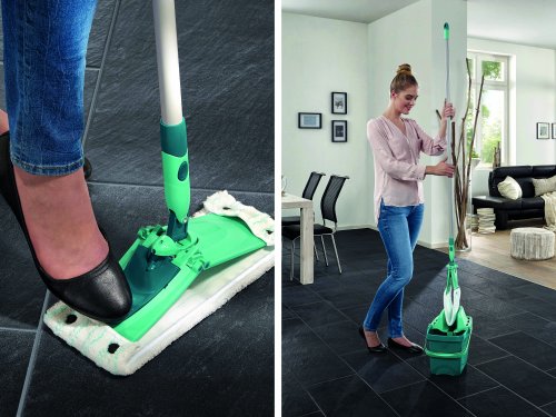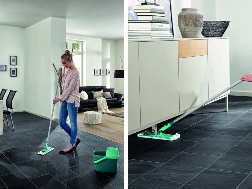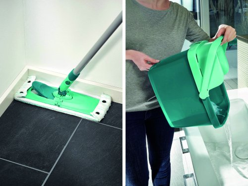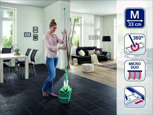Pro mokré vytírání dlažeb a kamenných povrchů. Vyměnitelné návleky ze speciálních mikrovláken s výbornou absorpcí nečistot. Možné prát v pračce bez aviváže. Kompatibilní s Click-systémem. Pohyblivý kloub pro vytírání do osmiček, schodů, rohů a jinak nepřístupných míst. Materiál: kov, plast. Rozměry 140 x 34 cm, velikost spodního dílu 34 cm, objem vědra 12 litrů. Záruka 3 roky. EAN 4006501553560