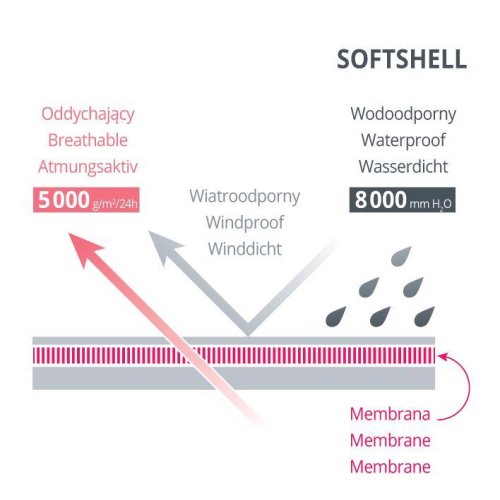Softshell je funkční materiál který zajišťuje prodyšnost a voděodolnost. Skládá se ze tří vrstev.