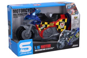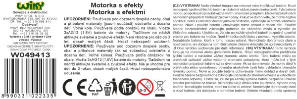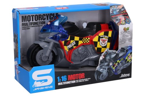 Motorka policie s efekty. Rozměry 25x12x15 cm. Volná kola. Vydává světelné a zvukové efekty. Aktivace tlačítkem na horní straně nádrže. Motorka má zavazadlový prostor na pravém boku, a vyklápěcí STOP ceduli na levém boku. Baterie 3xAG13, součástí balení.