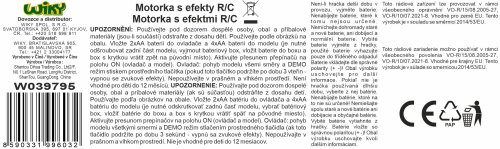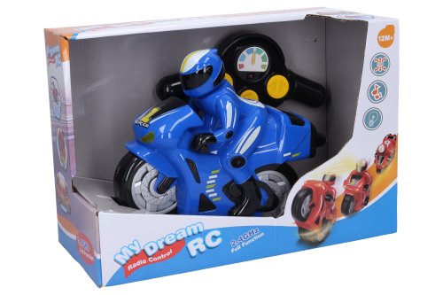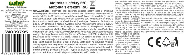 Motorka s efekty RC na dálkové ovládání. Rozměry 23x11x19 cm. Ovladač ve tvaru řídítek. Frekvence 2.4GHz. Světelné a zvukové efekty. 4xAA baterie do vytahovacího plastového boxu ze zadní strany motorky, 2xAA do ovladače nejsou součástí. Přepínač ON/OFF na spodní straně motorky a na ovladači. Ovladač - pohyb všemi směry, tlačítko - demo režim (podržením 3 vteřiny - vypnutí/zapnutí zvukových efektů.