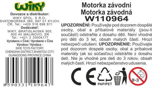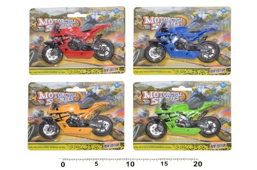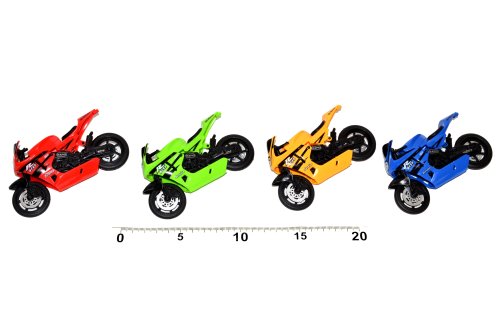Závodní motorka. Délka 11 cm. Volná kola. 4 varianty - modrá, zelená, červená, žlutá.