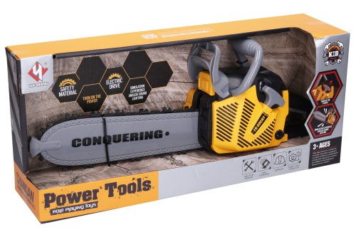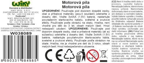 Motorová pila. Rozměry 43x10x18,5 cm. Světelné a zvukové efekty. 3xAAA baterie nejsou součástí. Nastartování povytažením startovacího kabelu.