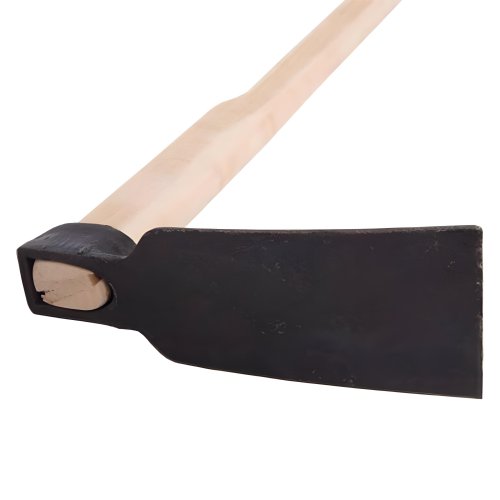 Kovaná motyka s násadou určená pro práce na zahradě.