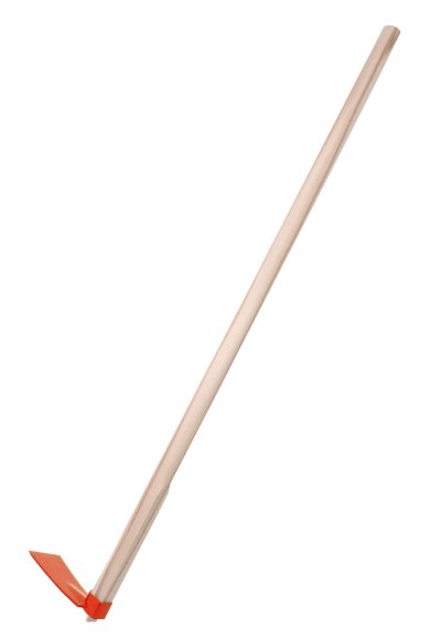 Plochá okopávací motyka s pracovní částí v kovovém provedení, s dřevěnou násadou.