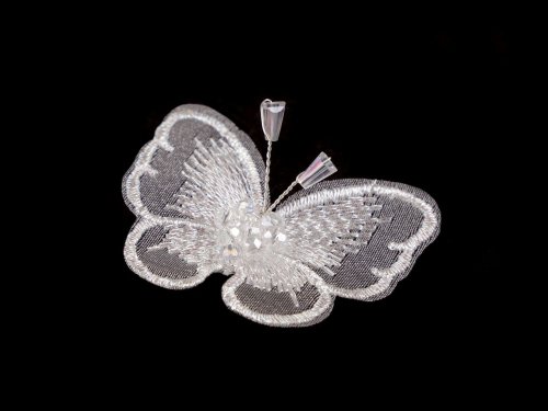 Motýl se skleněnými broušenými korálky z vyšívaného monofilu je jemný a elegantní doplněk. Dá se našít nebo nalepit na svetříky, halenky, šaty, kabátky, psaníčka, tašky nebo vlasové ozdoby, klobouky a čepice. Střed má ozdobený broušenými korálky, tykadla jsou z kroucených drátků zakončených korálky. Broušené korálky motýlovi přidávají bohatý a výrazný vzhled.