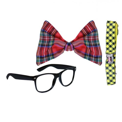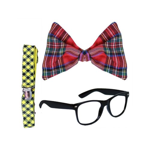 Originální sada pro všechny elegány! Karnevalová sada obsahuje motýlka na šňůrku, brýle a kšandy. Velikost motýlka je cca 20 cm. Perfektní kousky na párty!