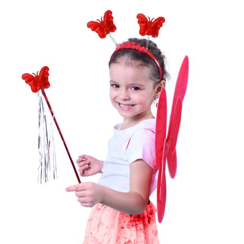 Roztomilá červená motýlí křidélka na gumičku jsou určena pro holčičky ve věkovém rozmezí 3-10 let (104-150 cm). Součástí této karnevalové sady je také čelenka s motýlky na pružinkách a hůlka.