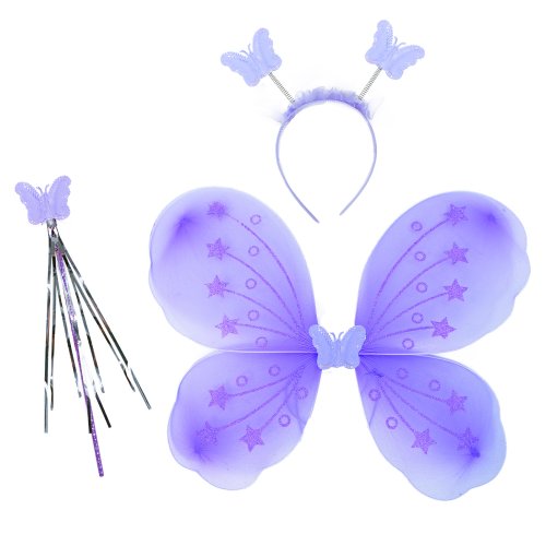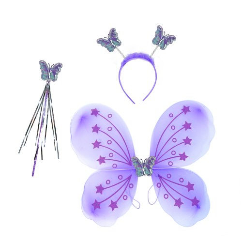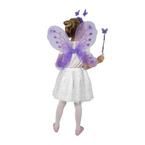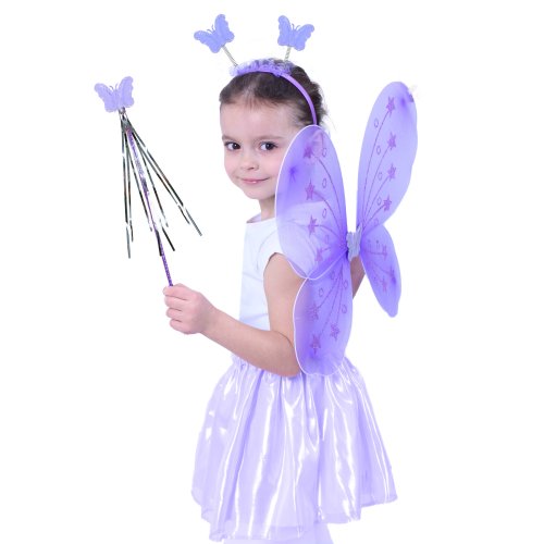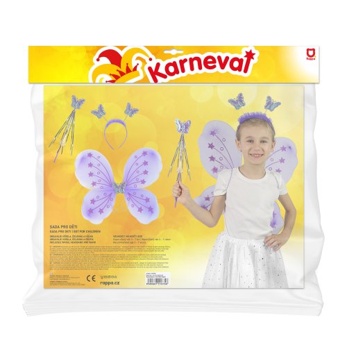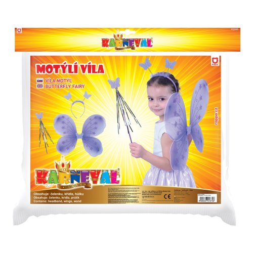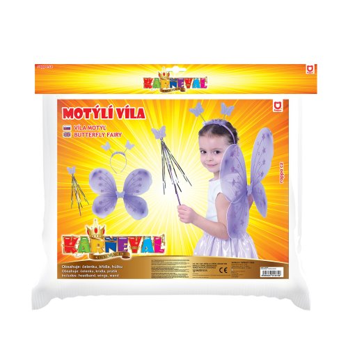 Roztomilá fialová motýlí křidélka na gumičku jsou určena pro holčičky ve věkovém rozmezí 3-10 let (104-150 cm). Součástí této karnevalové sady je také čelenka s motýlky na pružinkách a hůlka.