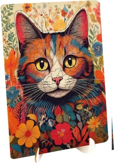 část dílků je ve tvaru zvířátek a předmětů, na podkladové desce jsou patrné obrysy dílků, puzzle je možné skládat na desce i bez desky (větší obtížnost), součástí balení je i praktický stojánek pro vystavení hotového obrázku.