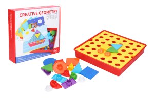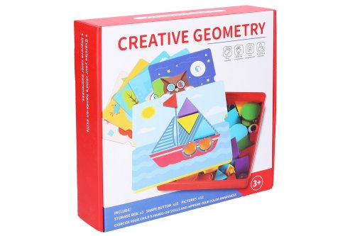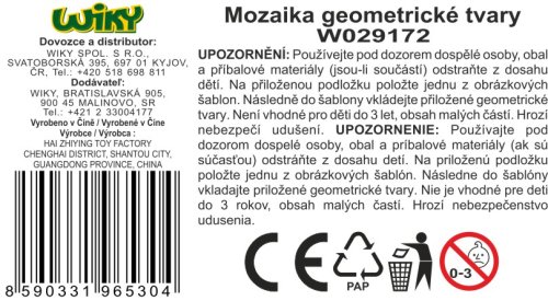 Mozaika geometrické tvary. Velikost 25x25 cm. Balení obsahuje krabičku s podložkou a šablonami na vkládání tvarů. 22 tvarů, 12 obrázků(šablon)