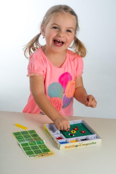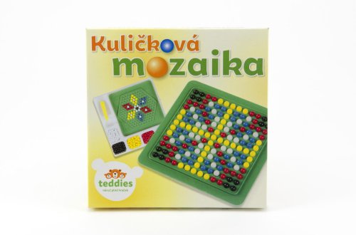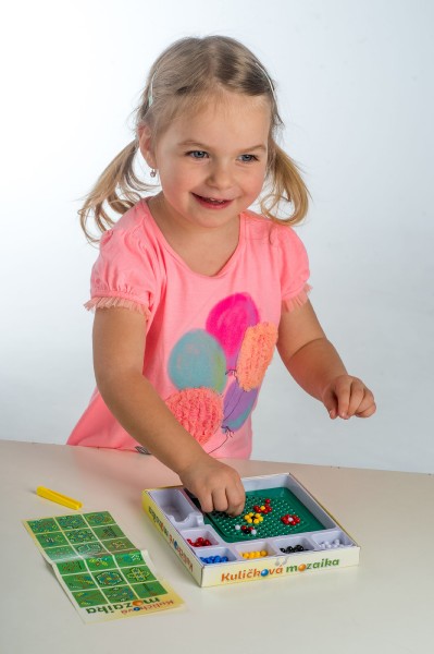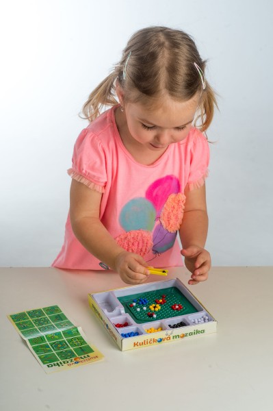 Za pomoci pinzety si děti skládají obrázky z barevných kuliček na podložku a tím si procvičují jemnou motoriku a šikovnost prstíků. Obrázky si mohou složit dle přiložených nákresů nebo dle své vlastní fantazie. Mozaika obsahuje 250 ks kuliček, pinzetu, oboustrannou destičku a papírové předlohy. Rozměr destičky: 12 x 12 cm, v krabičce Rozměr balení: 17 x 17 cm Vhodná od 3 let