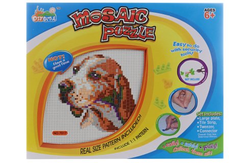 Mozaika s motivem pejska. Balení obsahuje základnu pro stavění obrázku, pinzetu a 2 háčky pro zavěšení hotového obrázku. Materiál plast. Rozměry základny 26,6x19,9 cm. Rozměry balení 30x23,5x4 cm. Věk 3+ (doporučeno od 6i let)