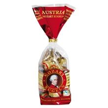 Mozartovy koule, tradiční pralinky plněné marcipánem (40%) a nugátovým krémem (33%) máčené v čokoládě
