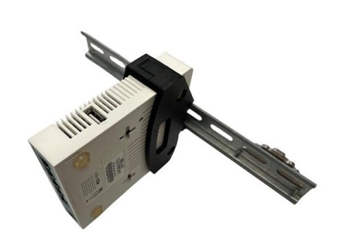 Plastový držák na DIN lištu umožňující vertikální uchycení produktu Mikrotik hEX PoE (RB960PGS) v racku.