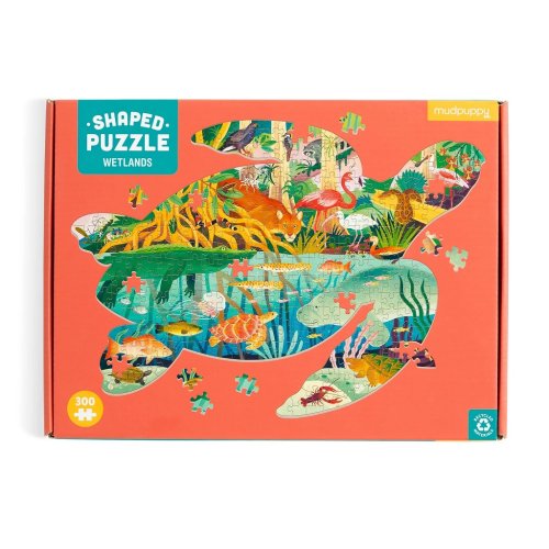 Puzzle Mokřady ve tvaru želvy od Mudpuppy obsahuje 300 dílků a má jasnou a barevnou scénu vašich oblíbených zvířat nalezených v mokřadech, včetně aligátora, pantera, vážek a mnoha dalších. Hotové puzzle má tvar želvy. Puzzle je baleno v pevné krabici, pro opětovné použití a skladování. Ideální jako dárek. Autor obrázku je Kaley McKean. Puzzle jsou vyrobeny za použití významného podílu recyklovaného papíru a nabízí špičkový potisk nezávadnými barvami. Jsou opatřeny matnou povrchovou úpravou, která zajišťuje za všech okolností věrné podání detailů i barev. Jejich zadní strana je potažena hladkým, na dotek příjemným povrchem, díky němuž se při skladování rozloženého puzzle netvoří prach. Spolu s pečlivě zabalenými dílky naleznete v balení také letáček s návodným obrázkem, který zpravidla obsahuje další informace o tvůrcích a pozadí vzniku díla. Dodáváno v mimořádně pevné a poutavě zpracované kartonové krabičce vyrobené z recyklovaného kartonu. Hlavní vlastnosti: 300 precizně vyřezaných dílkůvyrobeno s použitím recyklovaných a udržitelně získaných materiálůpečlivě vybraný motiv od renomovaných tvůrců a umělcůpotisk a provedení nejvyšší kvalityobsahuje návodný obrázek