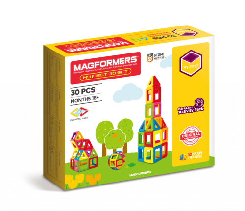 Sada pro nejmenší pro první seznámení s geniální stavebnicí MAGFORMERS. Dílky jsou plnobarevné (bez klasického poloprůzračného efektu) s výraznějšími barvami navrženými speciálně pro vnímání batolat a malých dětí. Mají zesílené stěny a jsou odolnější proti oděrům a pronikání vlhkosti. Absolutní zdravotní nezávadnost pro nezbytné ochutnávky dílků je samozřejmostí. Součástí balení je 5 oboustranných výukových karet , podle kterých se děti naučí stavět jednoduché domečky a geometrická tělesa. 10 modelových předloh slouží k navedení dětí a rodičů k vymýšlení nových tvarových kombinací a schematických modelů. K procvičování barev a tvarů slouží odolná 18ti-stránková knížka . Počet dílků: 30 18x čtverec, 12x trojúhelník Kreativní magnetická stavebnice Magformers umožňuje sestavovat velké množství trojrozměrných objektů, pomocí dvourozměrných plastových mnohoúhelníků. Magformers procvičuje jemnou motoriku, podněcuje tvořivost, učí děti barvy a základní geometrické tvary. Rozměry dílků a vhodně volené tvary zajišťují maximální možnou bezpečnost hračky . Materiál, z kterého je stavebnice vyrobena splňuje nepřísnější hygienická a zdravotní kritéria. Dílky jsou dostatečně velké, nelze je spolknout a jsou prakticky nerozbitné. MAGFORMERS lze velmi dobře kombinovat i se známou magnetickou stavebnicí Geomag. Vhodné pro děti od 18 měsíců. Magnetická stavebnice Můj první MAGFORMERS 30 dílků
